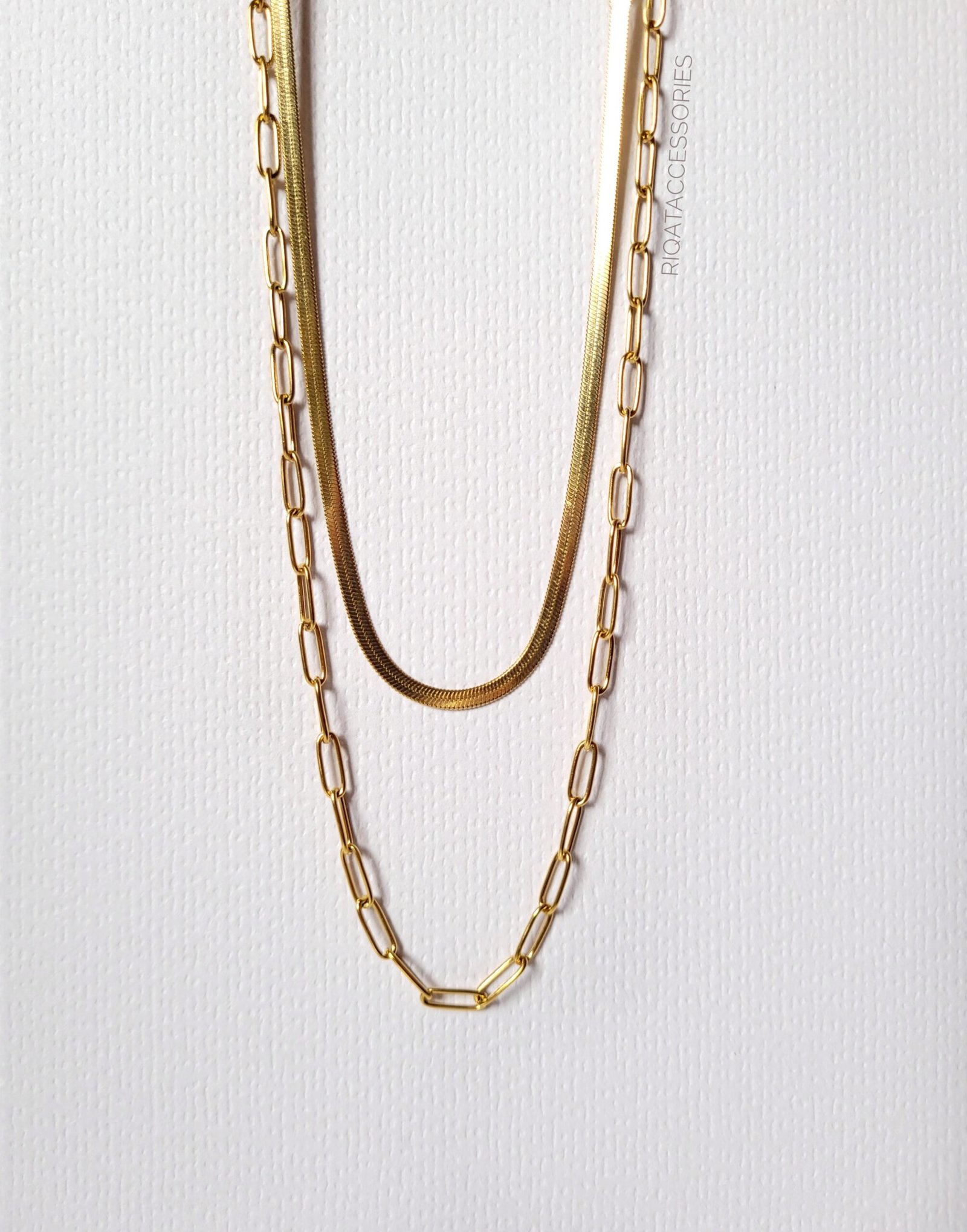 Experience the perfect blend of bold texture and deep, regal color with this stunning two-piece necklace set. This curated duo features a sleek, “liquid gold” herringbone chain paired with a sophisticated satellite chain adorned with a rich amethyst-style cabochon. Because each necklace is a completely separate piece with its own clasp, you have total styling freedom—wear them together for a modern, high-fashion stack or individually for a refined, minimalist touch. - Shipping: Available across Morocco (24–48 hours)