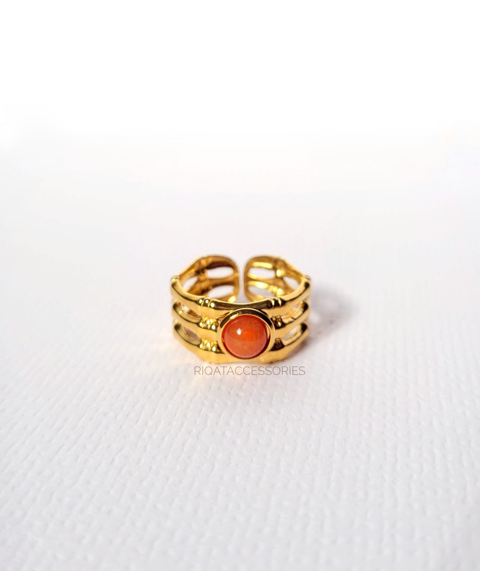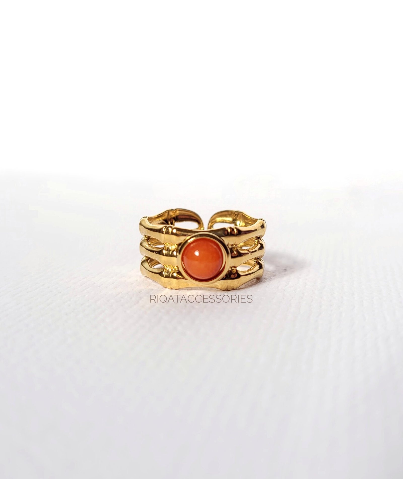 At its heart sits a vibrant, polished carnelian-orange cabochon, symbolizing energy and warmth. Because it is crafted from high-quality stainless steel, you can enjoy the luxurious look of gold without worrying about fading or skin irritation.