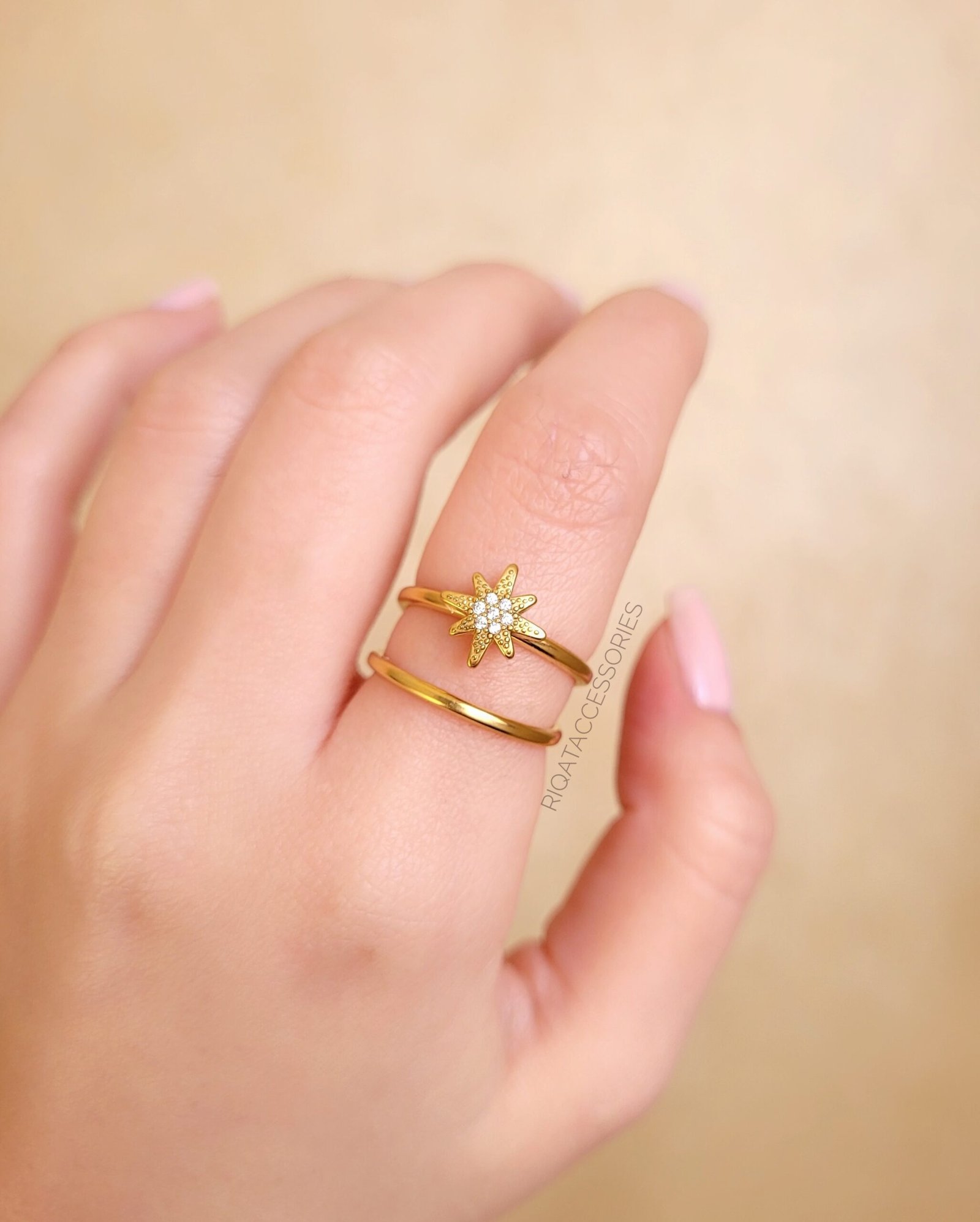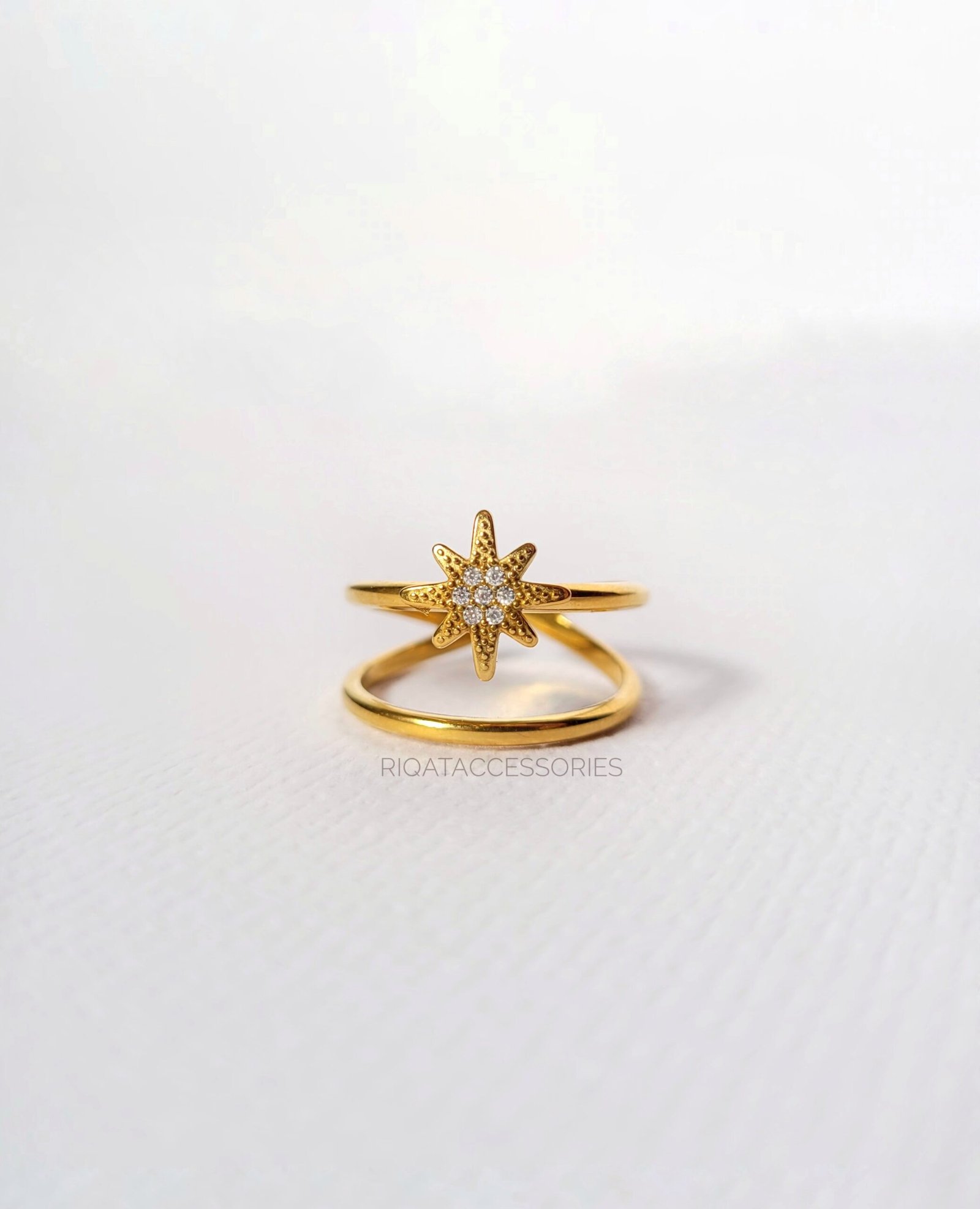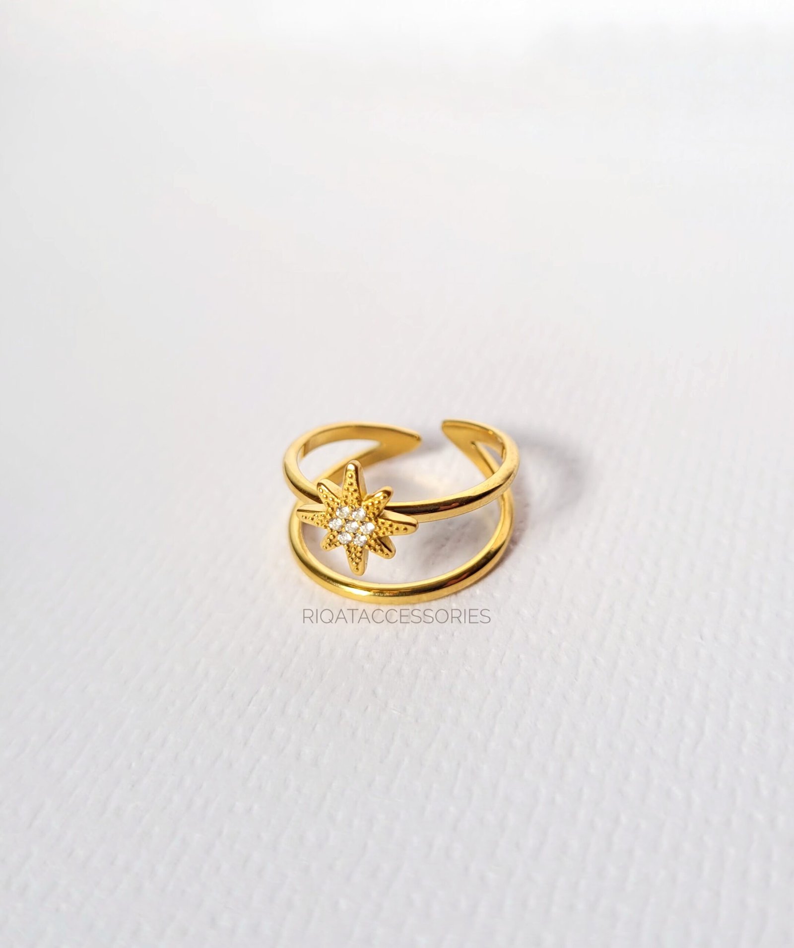 Guidance and elegance meet in this celestial-inspired piece. Featuring a shimmering North Star centerpiece set with dainty crystals, this ring utilizes a modern double-band design that creates an effortless stacked look with just one piece. Crafted from high-quality stainless steel, it is designed to maintain its heavenly glow through daily wear.