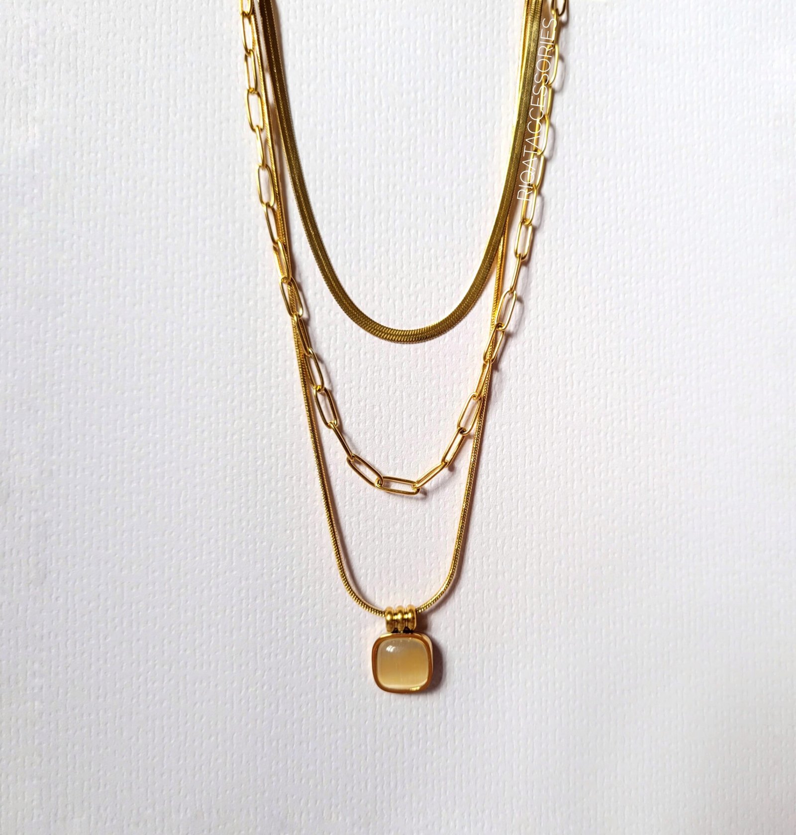 Indulge in effortless luxury with The Gilded Honey Set, a perfectly curated trio designed for the modern woman. This set features three distinct textures that work in harmony: a sleek “liquid gold” herringbone chain, a classic bold paperclip link, and a delicate gold chain featuring a soft, honey-toned square cabochon pendant. Because each necklace is completely separate with its own clasp, you have the ultimate styling freedom—wear all three for a high-fashion statement, mix and match two, or wear just one for a minimalist touch. - Shipping: Available across Morocco (24–48 hours)