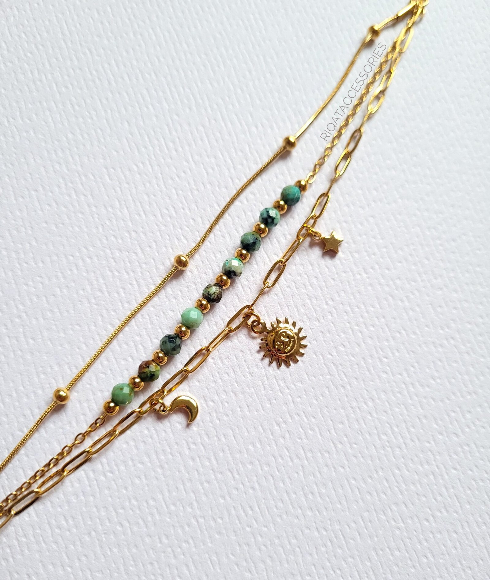 Embrace the beauty of the cosmos and the earth with the Mystic Garden Layered Bracelet. This stunning piece features three perfectly pre-stacked chains that offer a rich, textured look without the effort. The center features a curated mix of natural green stone beads, anchored by a celestial trio of charms: a smiling sun, a crescent moon, and a tiny star.